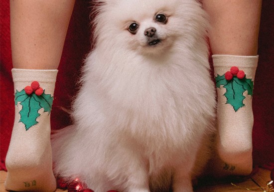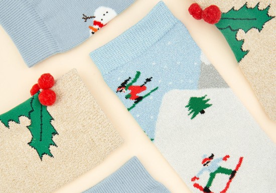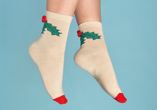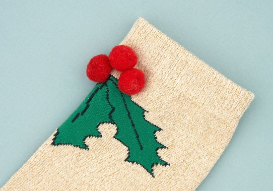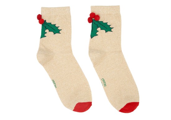 Pour un peu de magie de Noël à nos pieds, on enfile ces chaussettes couleur crème à paillettes et leur motif houx juste derrière la cheville, supplément pompons !
