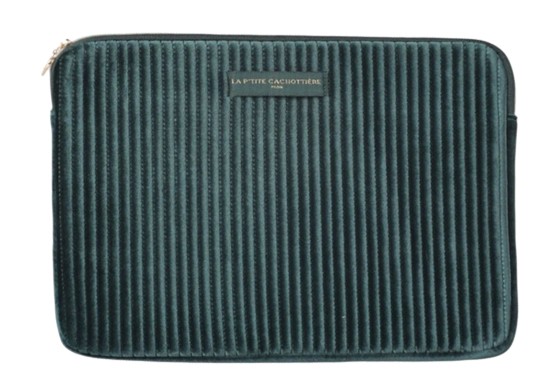 Pochette matelassée en velours vert foncé, servant de housse de protection pour un ordinateur 13 pouces.