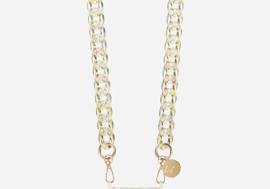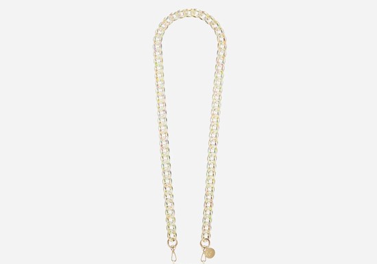 Chaîne en résine cristal, longue de 120 cm, se clipsant sur les coques à anneaux ou les adaptateurs avec ses mousquetons dorés.