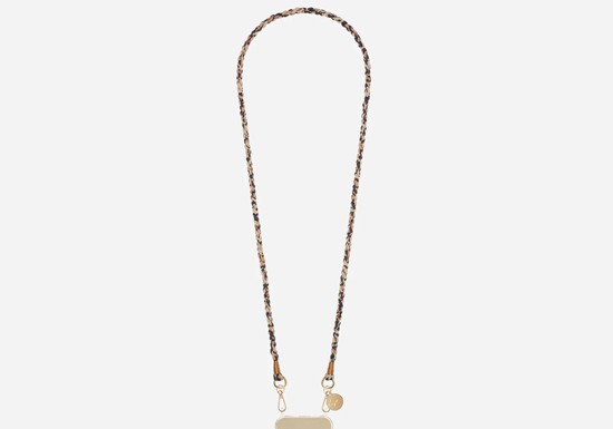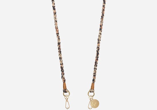 Chaîne en tissu léopard marron tressé et se terminant par des fils de bronze, longue de 120 cm, se clipsant sur les coques à anneaux ou les adaptateurs avec ses mousquetons dorés.