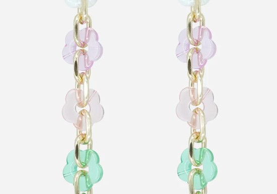 Chaîne en résine avec des maillons dorées et en forme de fleurs couleur pastel, longue de 120 cm, et se clipsant sur les coques à anneaux ou les adaptateurs avec ses mousquetons dorés.