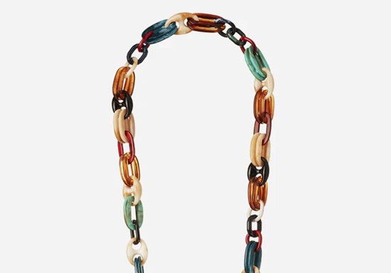 Chaîne en résine multicolore, longue de 120 cm, se clipsant sur les coques à anneaux ou les adaptateurs avec ses mousquetons dorés.
