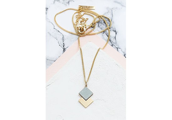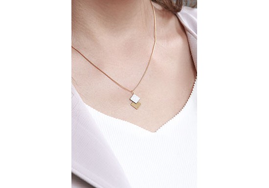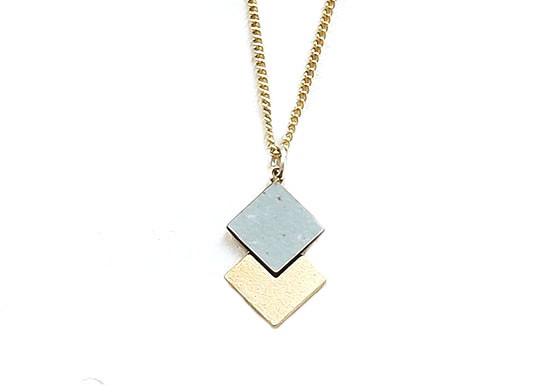 Collier délicat dont le pendentif se compose de 2 carrés, l'un en formica sur l'autre en laiton.
