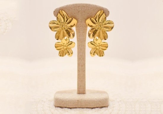 Grandes boucles d'oreilles dorées et martelées en forme de fleurs.