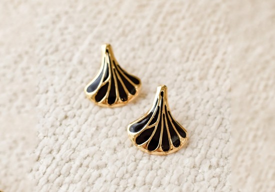Boucles à puces, dorées en forme d'éventail Art Deco émaillé noir.