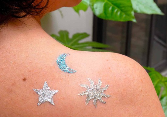 Etoile, lune et soleil sont les formes idéales pour des tatouages pailletés qui illumineront vos festivals, anniversaires et soirées pailletées.