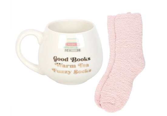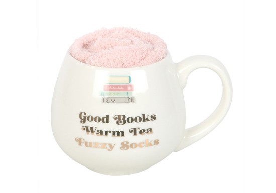 Installez-vous confortablement avec ce set comprenant une tasse en céramique et des chaussettes toutes moelleuses, arborant la phrase "Good Books, warm tea, fuzzy socks".