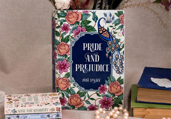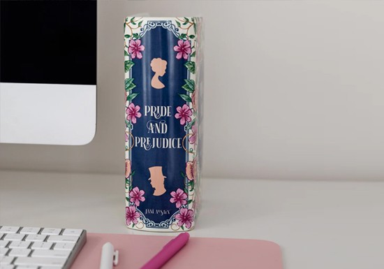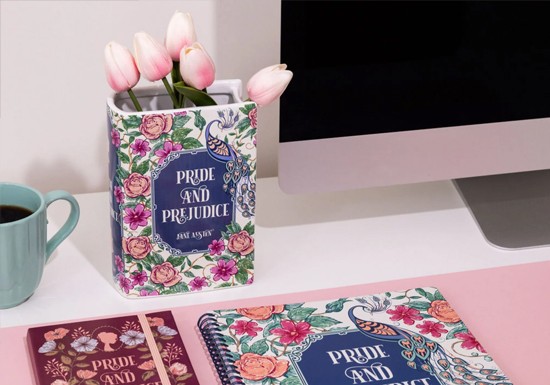 Grand vase en forme de livre, inspiré du l'oeuvre de Jane Austen, Pride and Prejudice (Orgueil et préjugés).